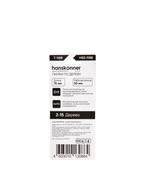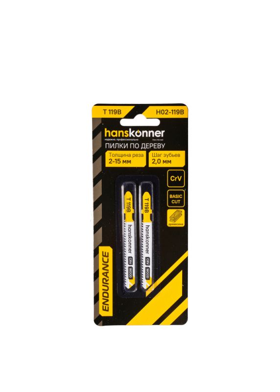 Пилки для лобзика по дереву 2шт, T119B (дерево, фанера 3-20мм) Hanskonner, H02-119B
