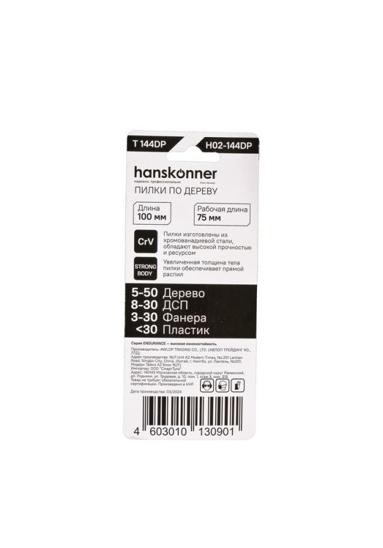 | Длина лезвий, мм | Пилки для лобзика по дереву 2шт, T144DP (дер 5-50мм, пласт<30мм) Hanskonner |
