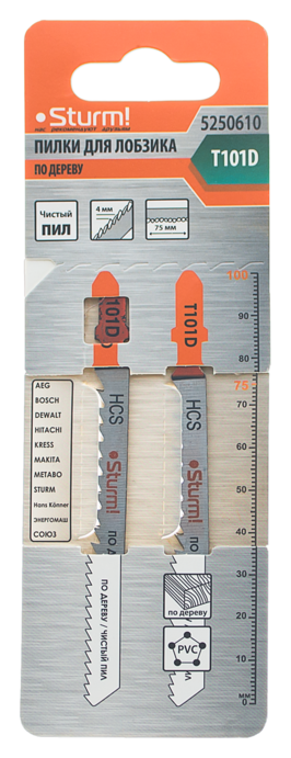 | Длина лезвий, мм | Пилки для лобзика по дереву T101D, 2 шт, 100х75мм, шаг зуба 4мм, чистый прямой рез, HCS, Sturm! |