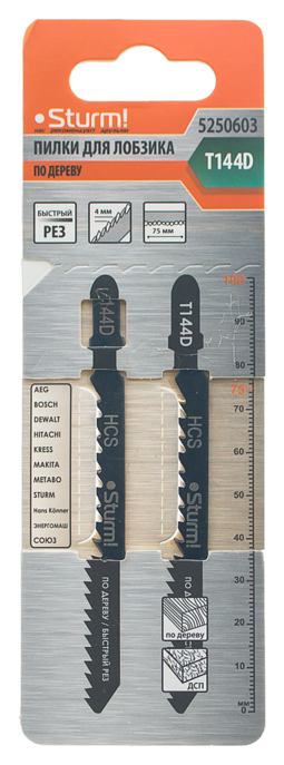 | Длина лезвий, мм | Пилки для лобзика по дереву T144D, 2 шт, 100х75мм, шаг зуба 4мм, быстрый прямой рез, HCS, Sturm! |