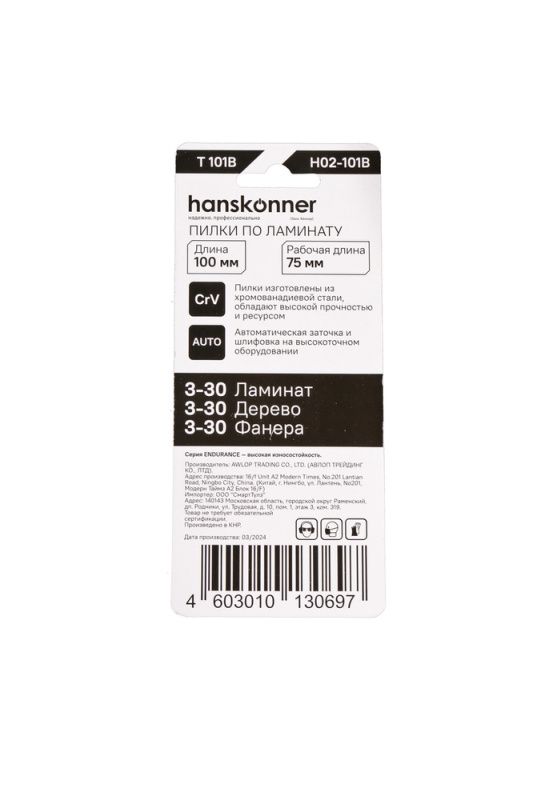 | Длина лезвий, мм | Пилки для лобзика по ламинату 2шт, T101B (дер,ДСП,фанера 3-30мм) Hanskonner |