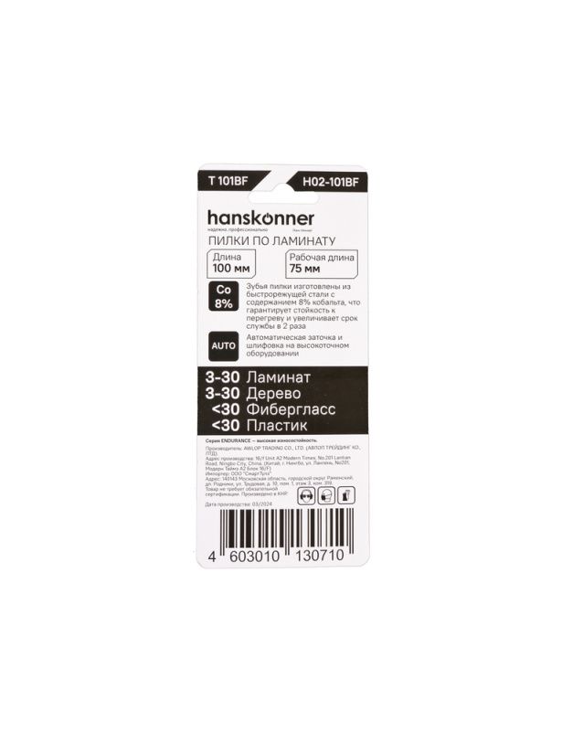 | Длина лезвий, мм | Пилки для лобзика по ламинату 2шт, T101BF (дер,пласт.,фибер.3-30мм) Hanskonner |