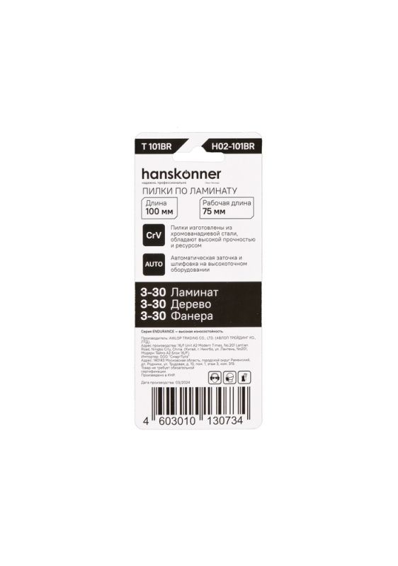 | Длина лезвий, мм | Пилки для лобзика по ламинату 2шт, T101BR (дер,ДСП,фанера 3-30мм) Hanskonner |