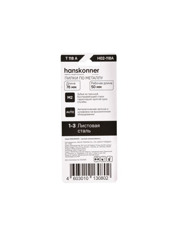 | Длина лезвий, мм | Пилки для лобзика по мет. 2шт тонк.прям.рез (лист 1-3мм,проф.10-30мм) Hanskonner |