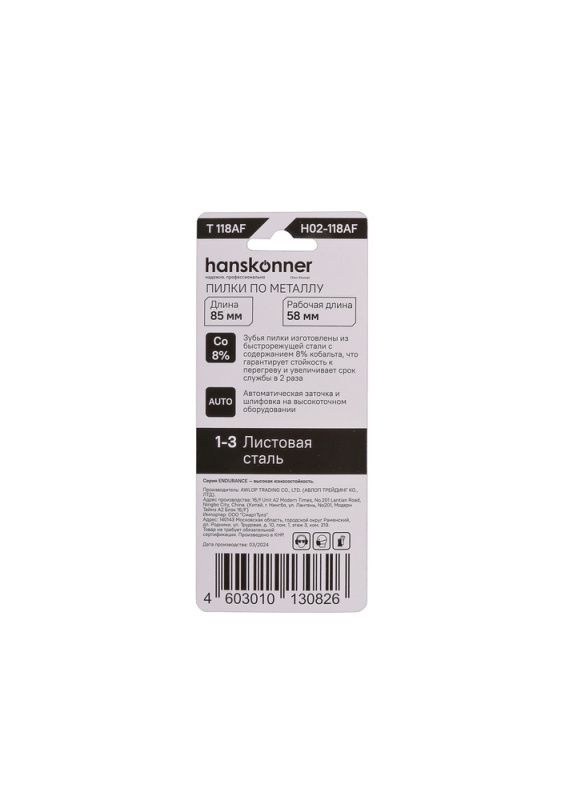 | Длина лезвий, мм | Пилки для лобзика по металлу 2шт, T118AF (лист 1-3мм, проф.10-30мм) Hanskonner |