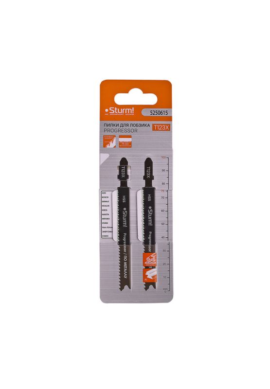 | Длина лезвий, мм | Пилки для лобзика по металлу T123X, 2 шт, 100х75мм, шаг зуба 1,2-2,6мм, ПРОГРЕССОР, HСS, Sturm! |