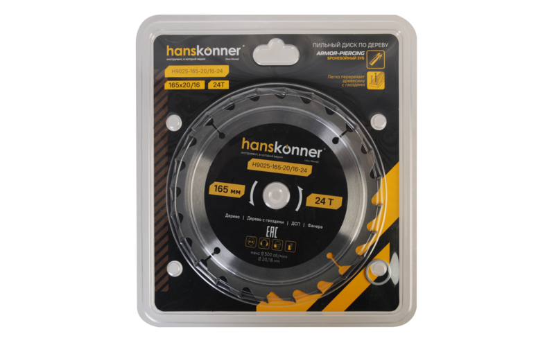 Пильный диск по дереву ArmorPiercing 165x20/16мм, 24 зуба, Hanskonner, H9025-165-20/16-24