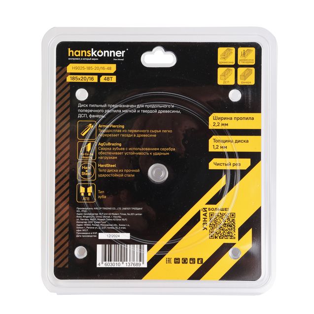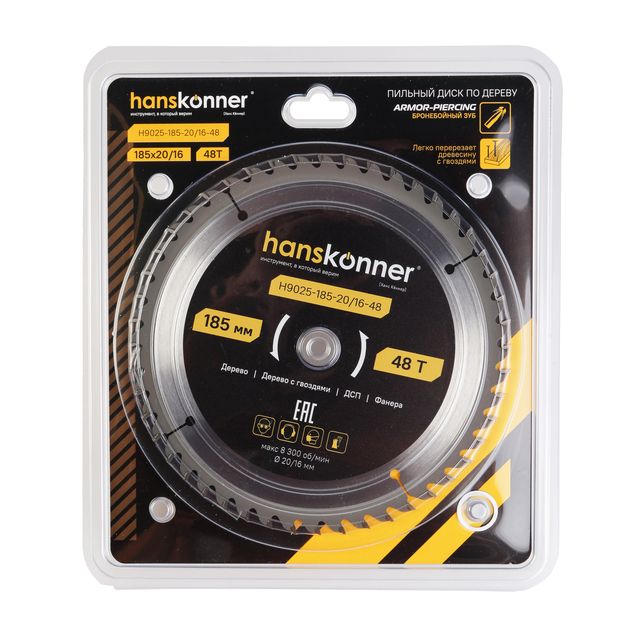 Пильный диск по дереву ArmorPiercing 185x30/20мм, 48 зубьев, Hanskonner, H9025-185-20/16-48