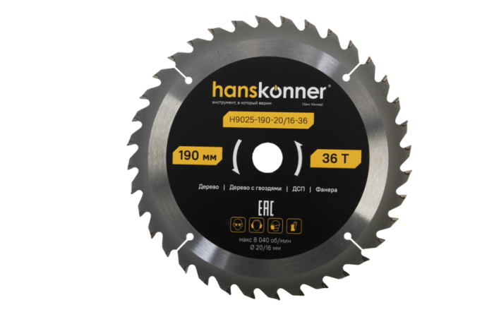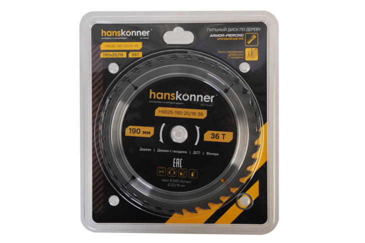 Пильный диск по дереву ArmorPiercing 190x20/16мм, 36 зубьев, Hanskonner, H9025-190-20/16-36