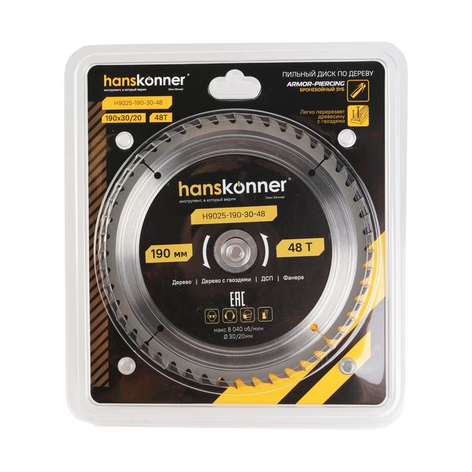 Пильный диск по дереву ArmorPiercing 190x30/20мм, 48 зубьев, Hanskonner, H9025-190-30-48