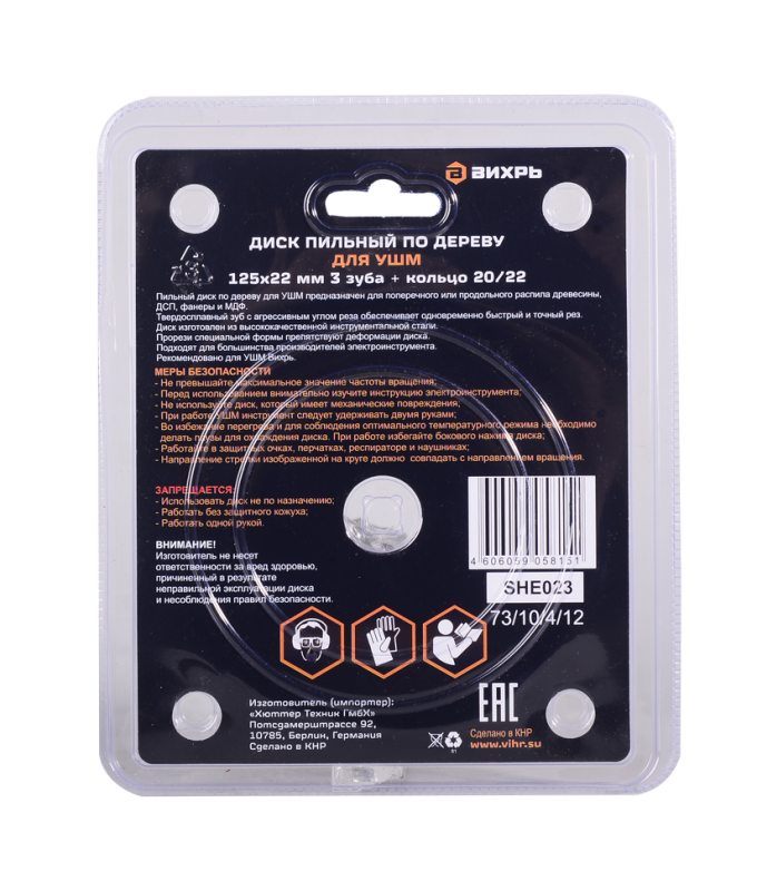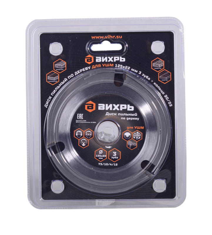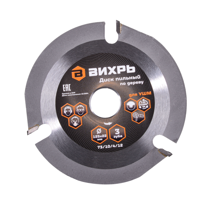 Диск пильный по дереву для УШМ Вихрь 125х22 мм, 3 зуба + кольцо 20/22, 73/10/4/12
