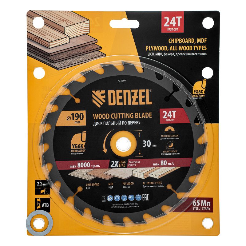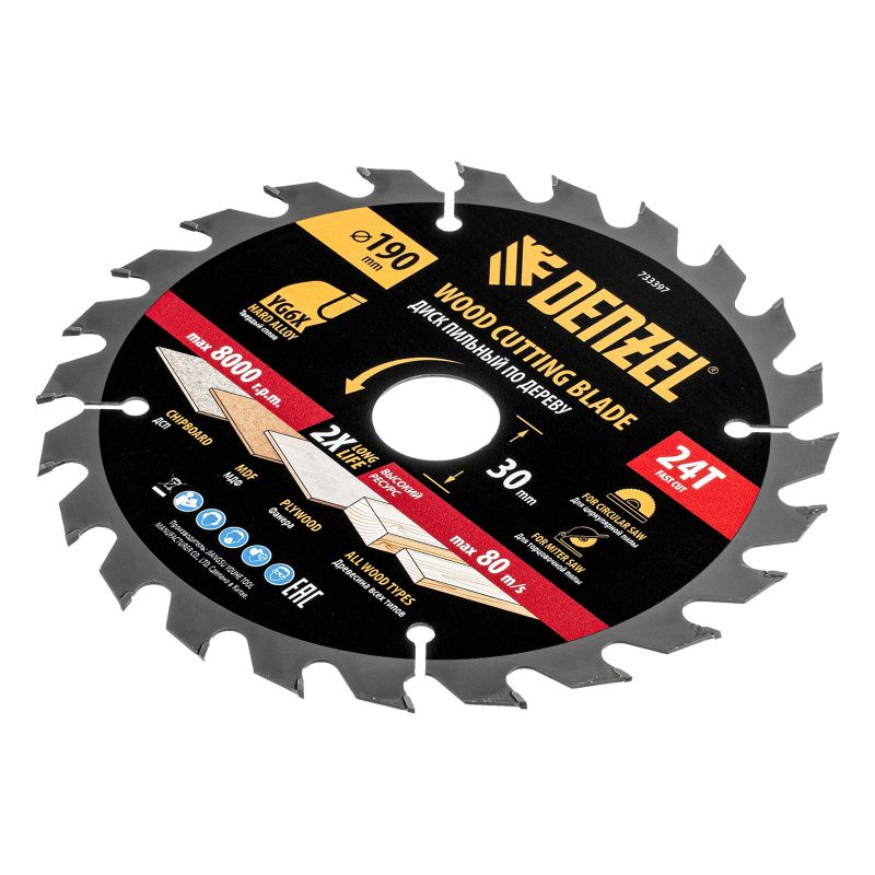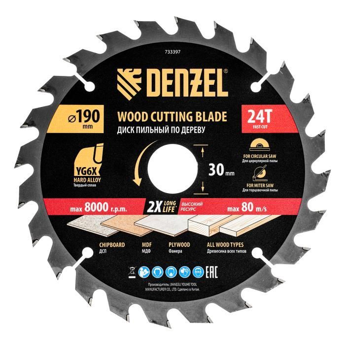 Пильный диск по дереву ф190 х 30 мм, 24 зубьев Denzel, 733397