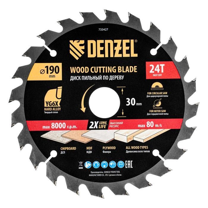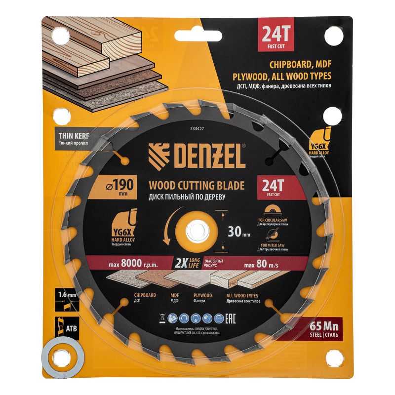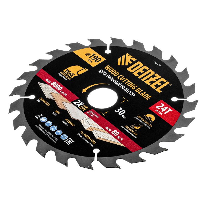 Пильный диск по дереву ф190 х 30 мм, 24 зубьев, тонкий Denzel, 733427