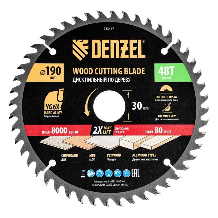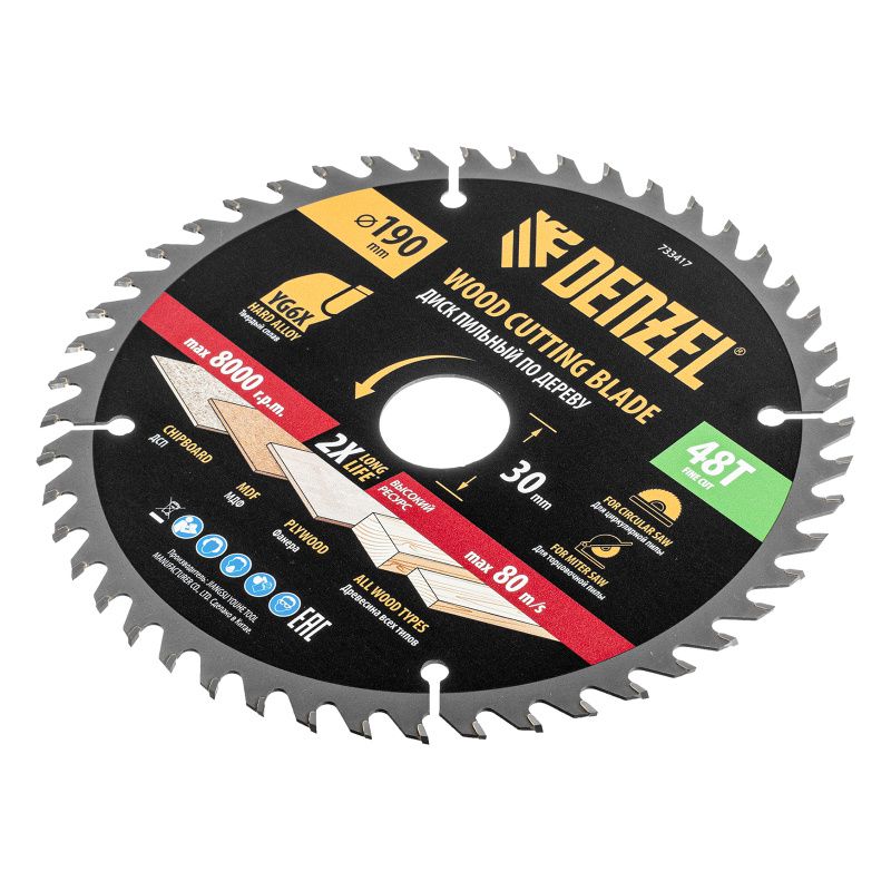 Пильный диск по дереву ф190 х 30 мм, 48 зубьев Denzel, 733417