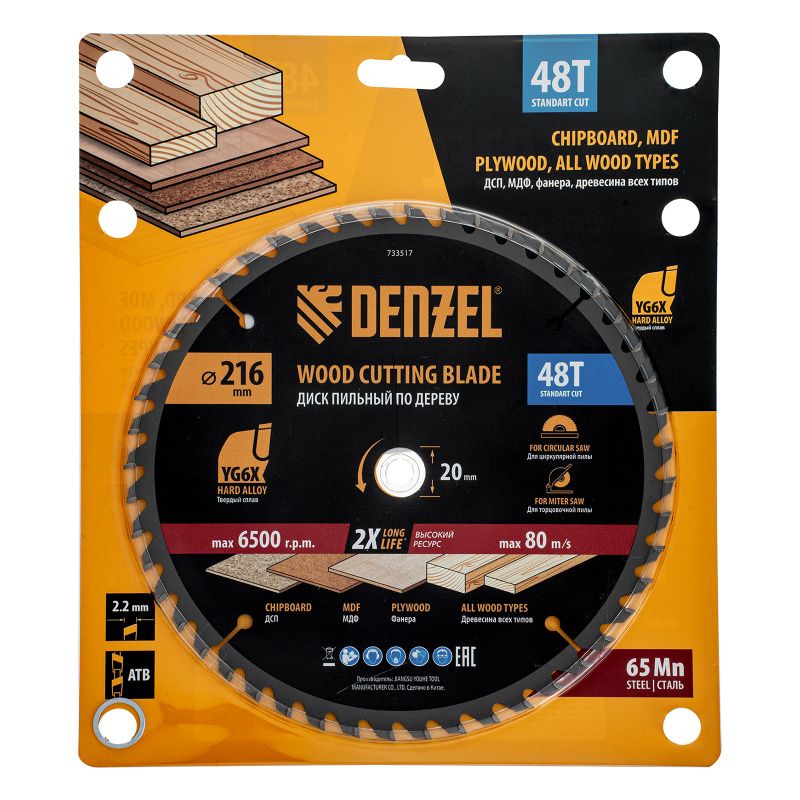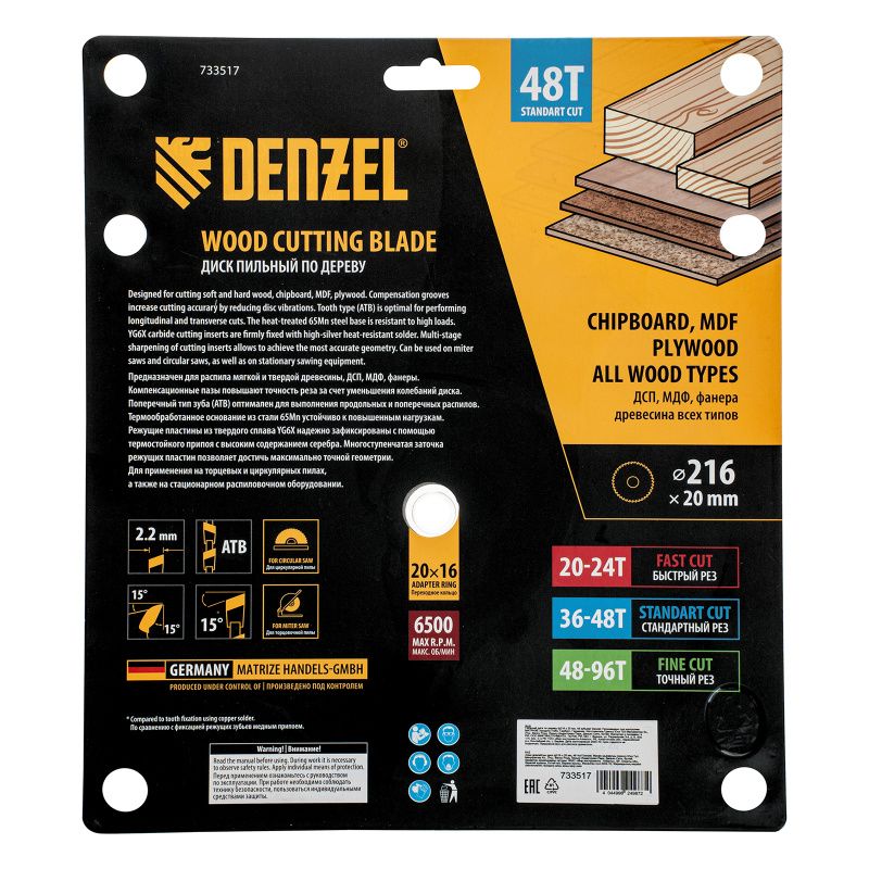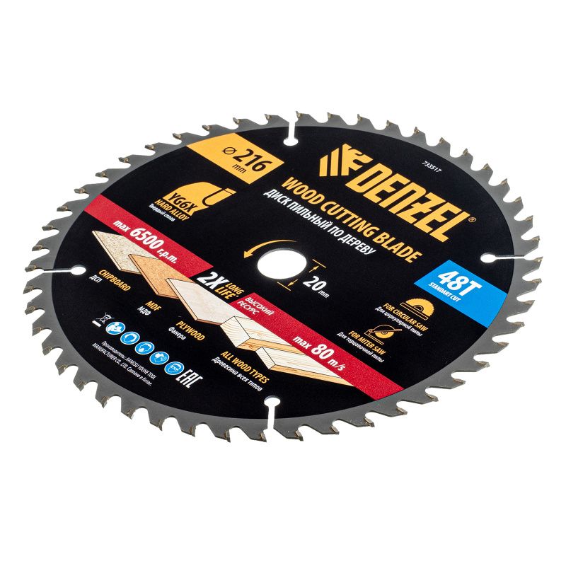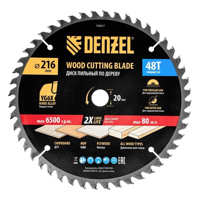 Пильный диск по дереву ф216 х 20 мм, 48 зубьев Denzel, 733517