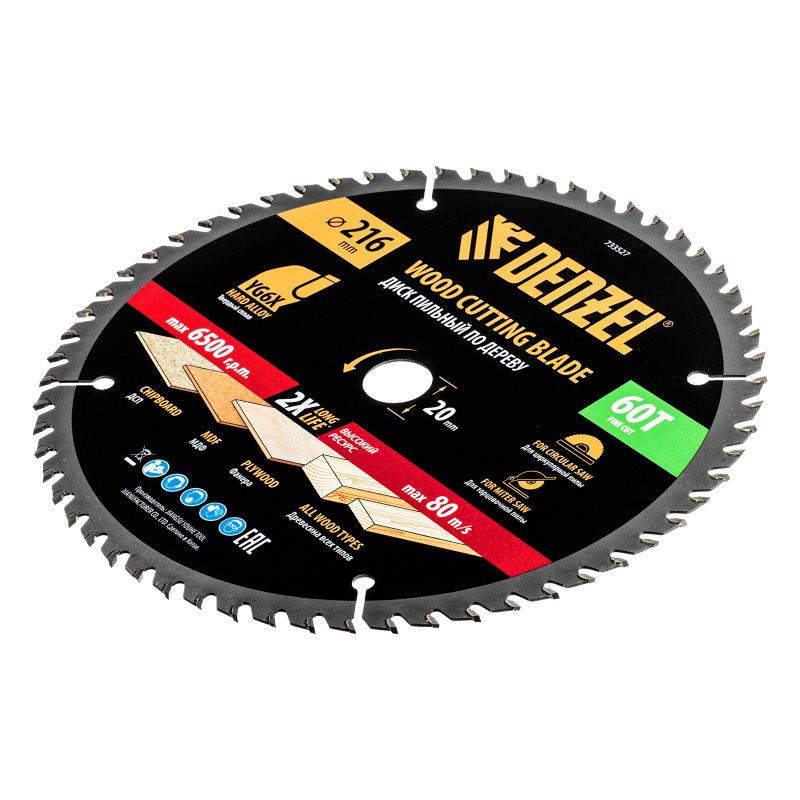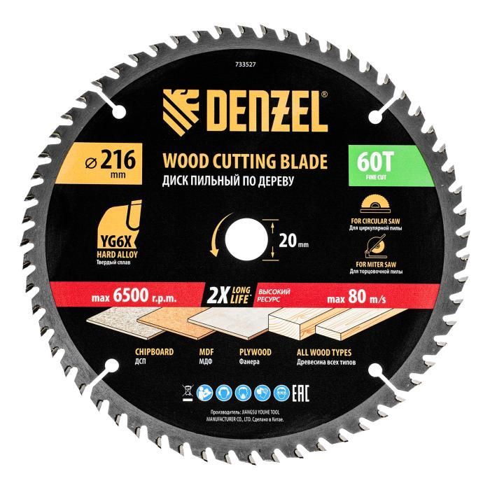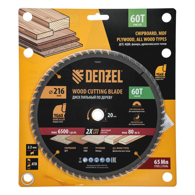 Пильный диск по дереву ф216 х 20 мм, 60 зубьев Denzel, 733527
