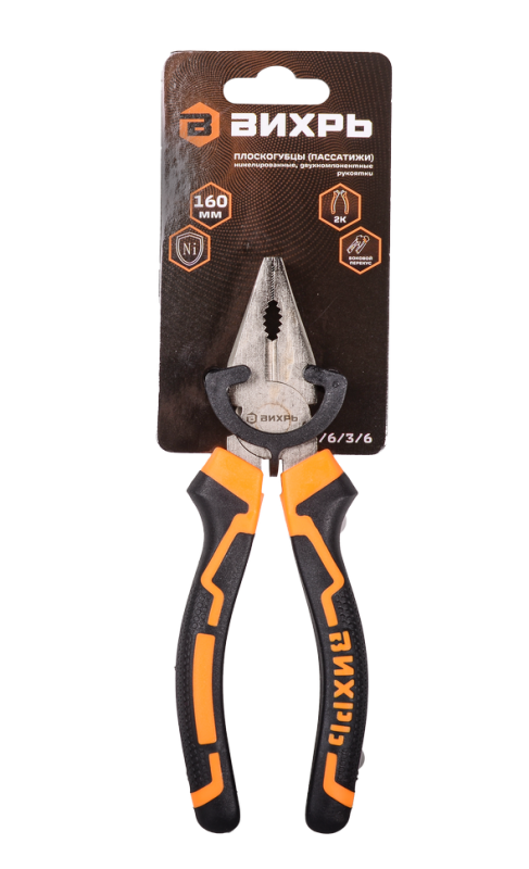 Плоскогубцы (пассатижи), 160мм., никелированные, двухкомпонентные рукоятки, Вихрь, 73/6/3/6