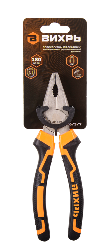 Плоскогубцы (пассатижи), 180мм., никелированные, двухкомпонентные рукоятки, Вихрь, 73/6/3/7