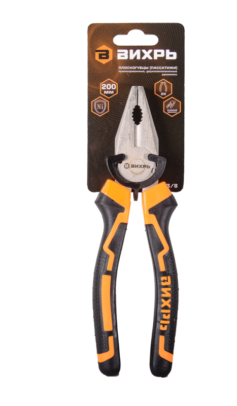 Плоскогубцы (пассатижи), 200мм., никелированные, двухкомпонентные рукоятки, Вихрь, 73/6/3/8