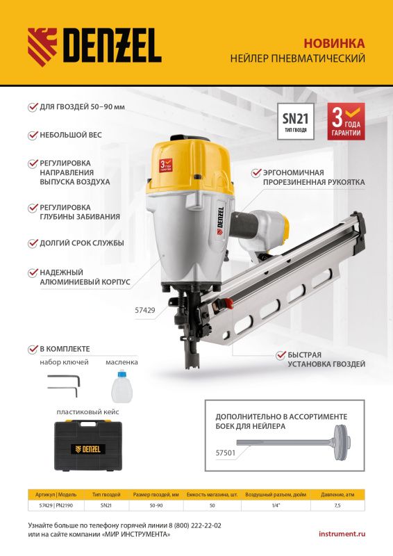 Нейлер пневматический PN2190 для гвоздей SN21 от 50 до 90 мм Denzel, 57429