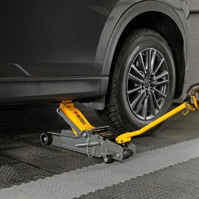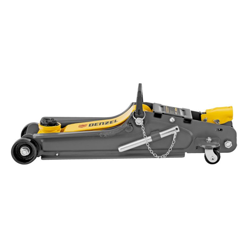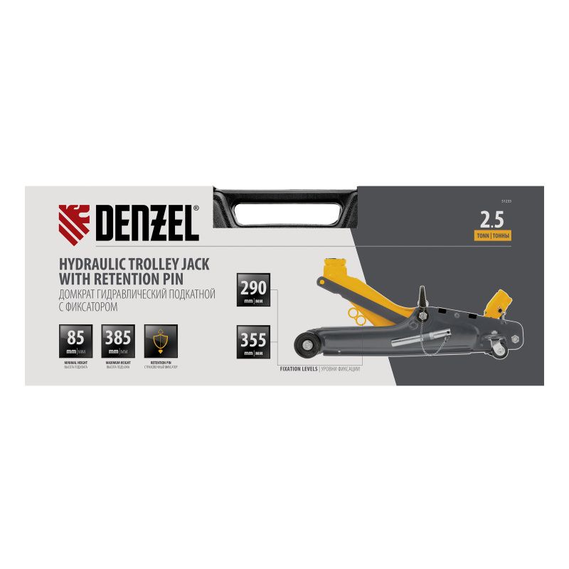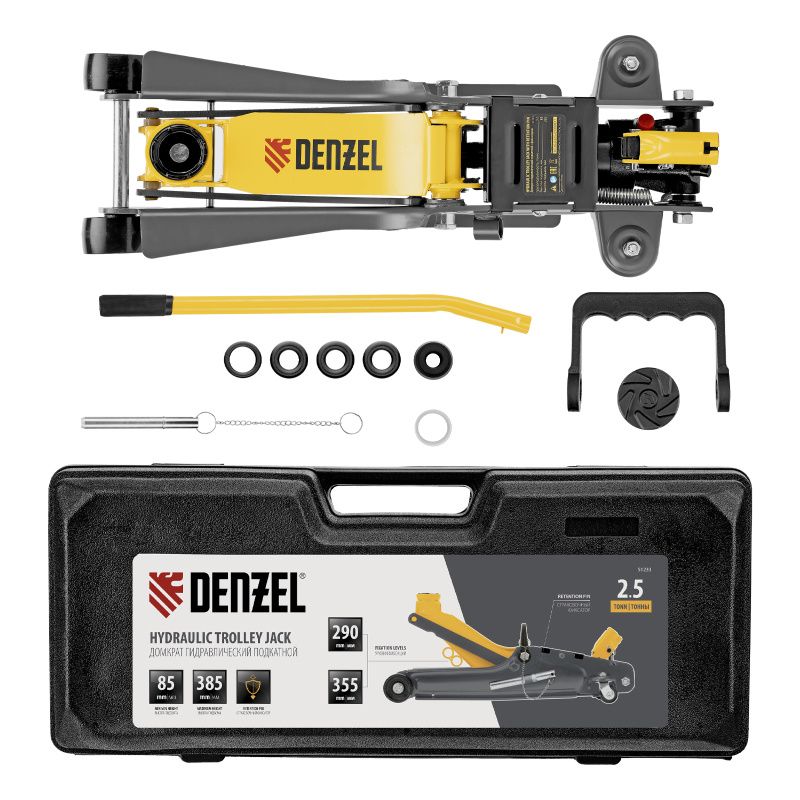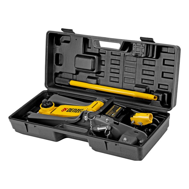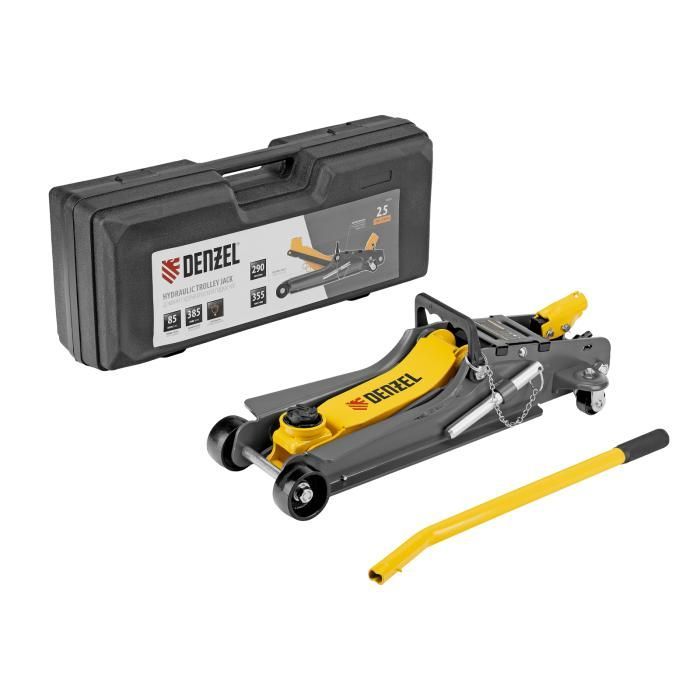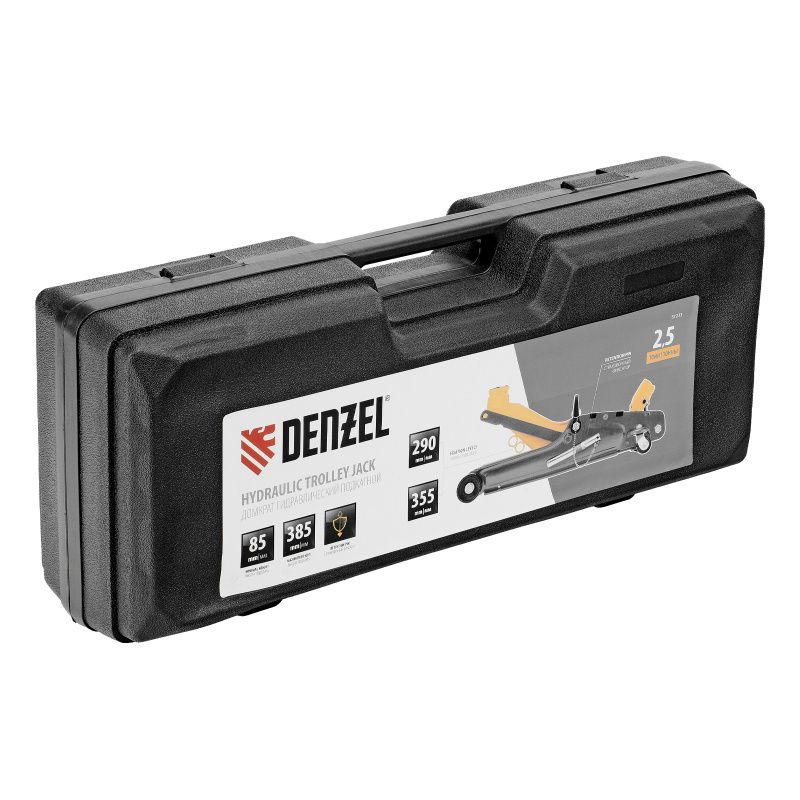 Домкрат гидравлический подкатной с фиксатором, 2,5 т, 85-385 мм, в пласт. кейсе Denzel, 51233