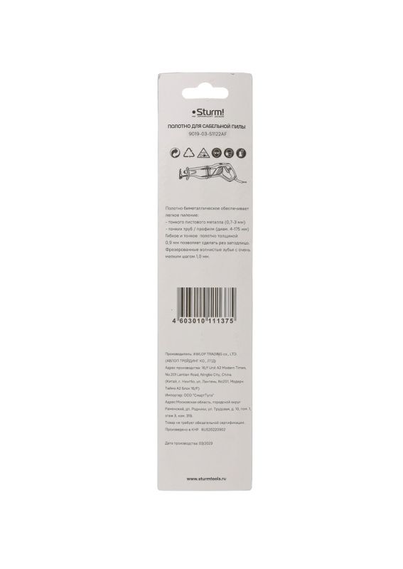 Полотно для сабельной пилы МЕТАЛЛ 2шт 225/1мм (тонк лист/труб/проф) Sturm, 9019-03-S1122AF