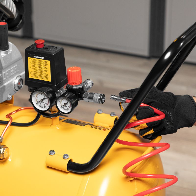 В комплекте с компрессором может быть поставлен широкий набор аксессуаров, включающий в себя различные насадки и шланги (приобретается дополнительно). Это позволяет использовать оборудование для разных целей и задач. Вы сможете накачивать шины, очищать поверхности, покрывать краской, а также выполнять другие работы, требующие сжатого воздуха.