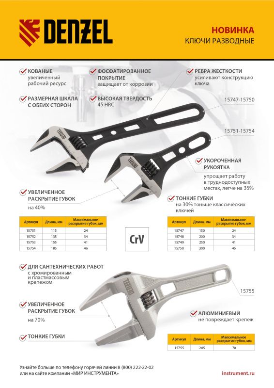 Ключ разводной Denzel 250 мм, CrV, 15749