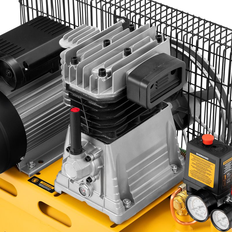 Ременной привод: компрессор Denzel BCI2300/50 оснащён ременным приводом, который обеспечивает эффективную передачу мощности и снижает нагрузку на двигатель.
