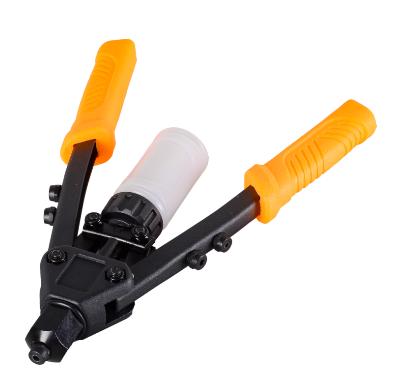 В комплект входят 4 насадки под диаметры 2.4, 3.2, 4.0, 4.8 мм, контейнер для отработанных заклепок и ключ для их замены.