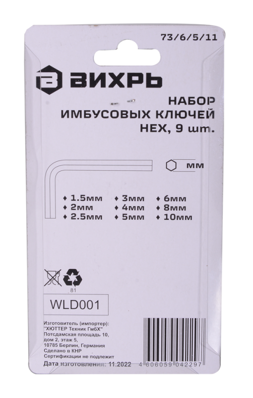 Набор ключей имбусовых Вихрь HEX, 9 шт, 1.5-10 мм, 73/6/5/11
