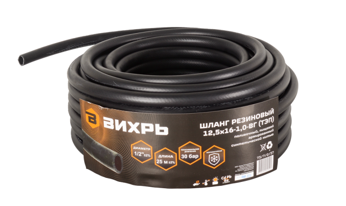 | Модель | Шланг Вихрь резиновый армированный, 12,5 х 16- 1,0 - ВГ., бухта 25м (чёрный) ТЭП |