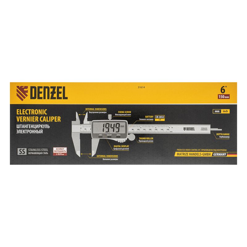 Штангенциркуль, 150 мм, электронный, большой дисплей, с глубиномером Denzel, 31614