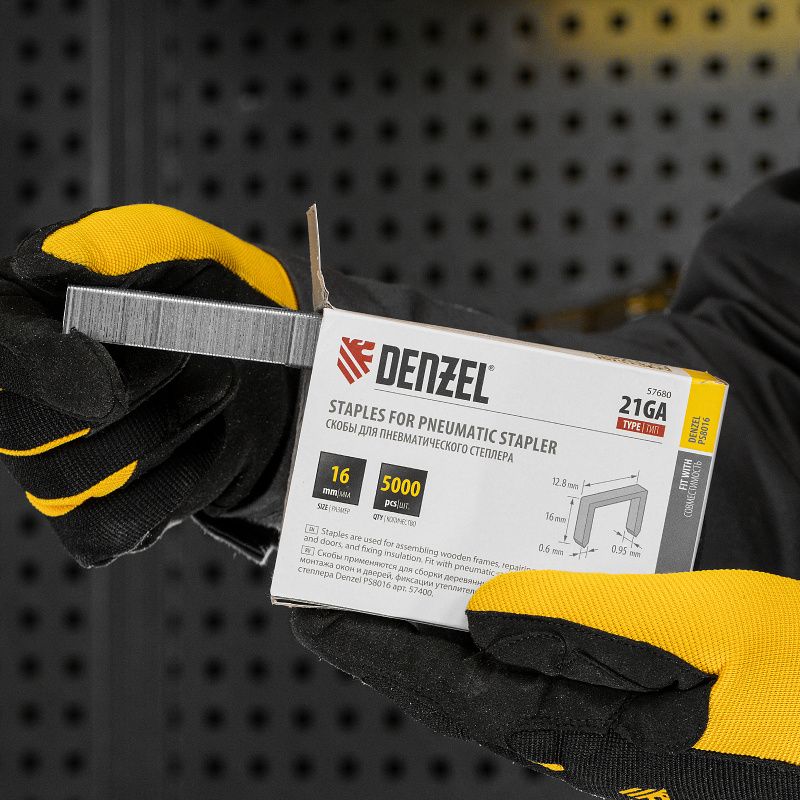 Скобы 21GA для пнев. степл., 16мм, шир. - 0,95мм, тол. - 0,6мм, шир. скобы - 12,8мм, 5000шт Denzel, 57680