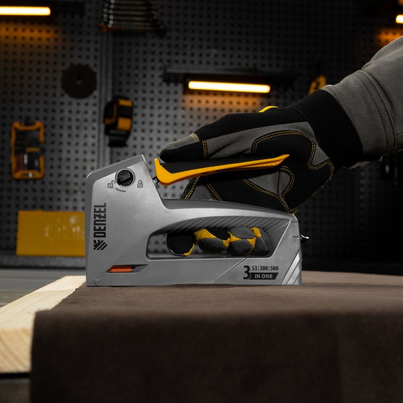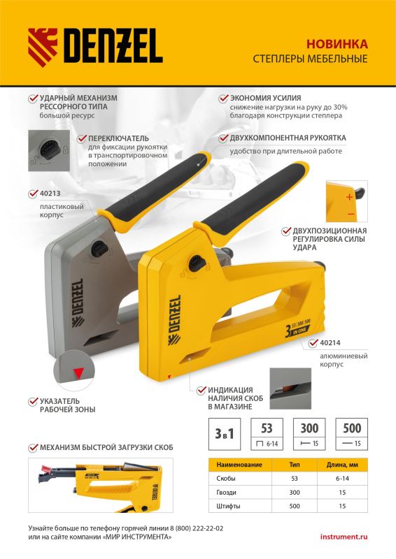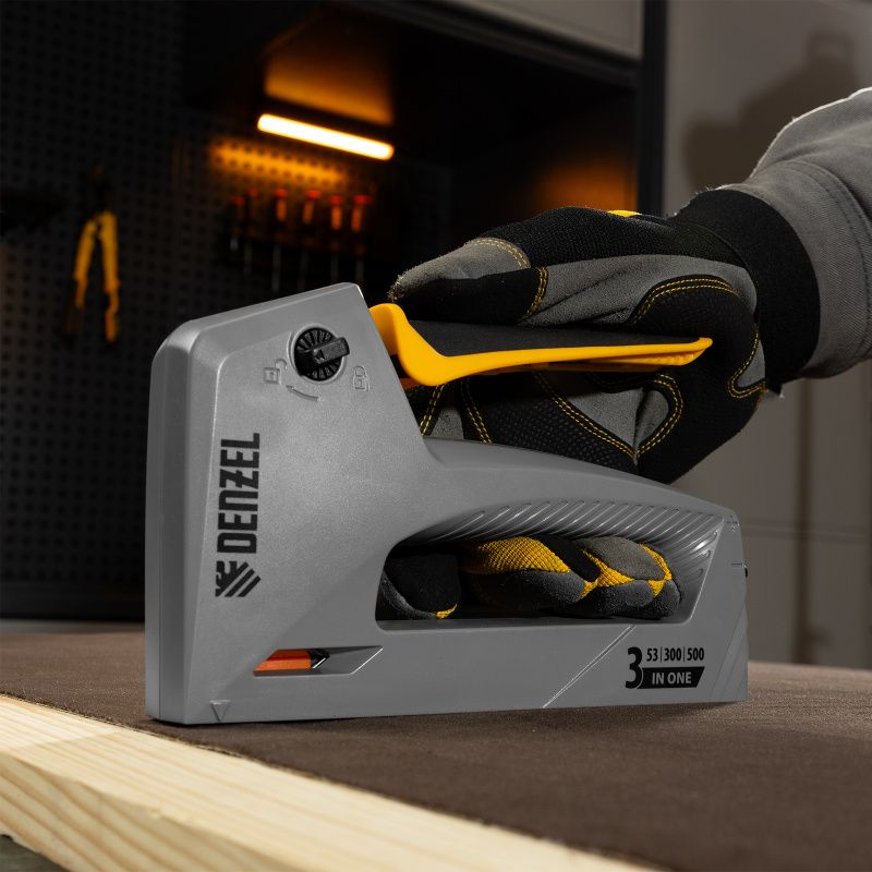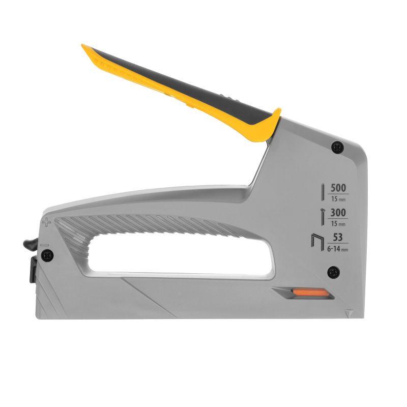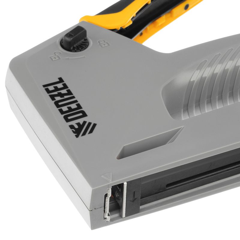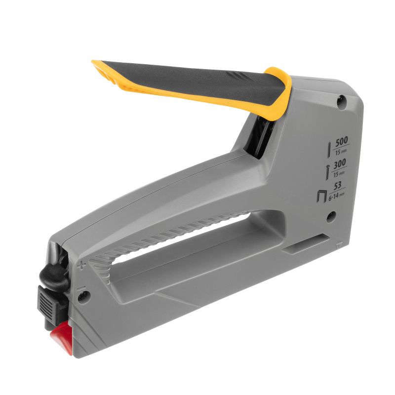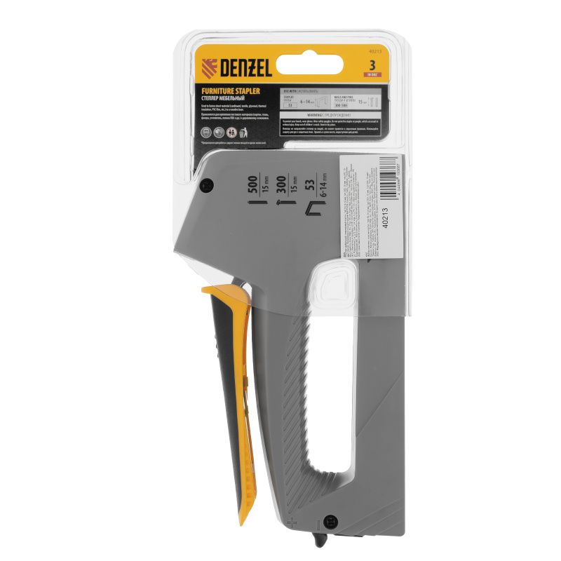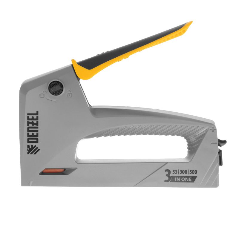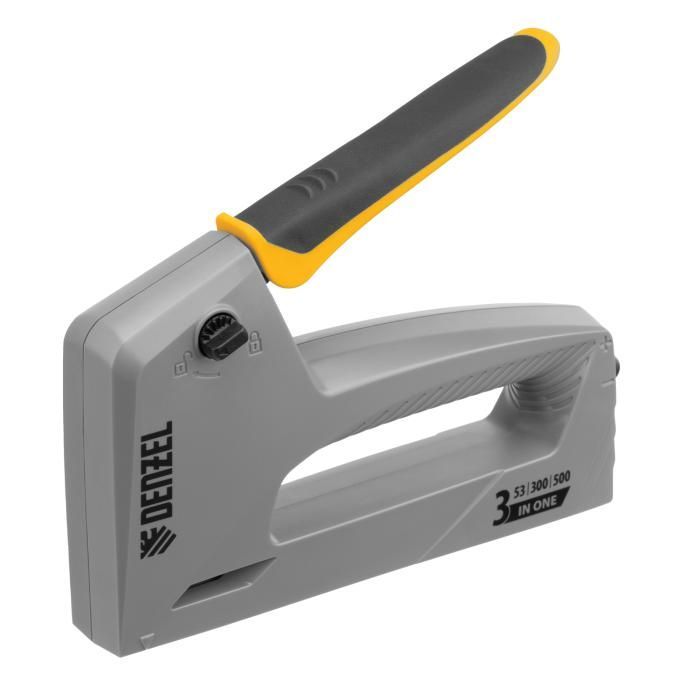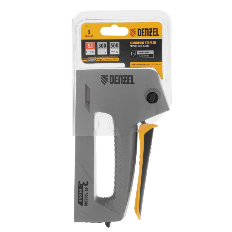 Степлер мебельный, пластиковый корпус, тип 53, 6-14 мм, тип 300, 15 мм, тип 500, 15 мм Denzel, 40213