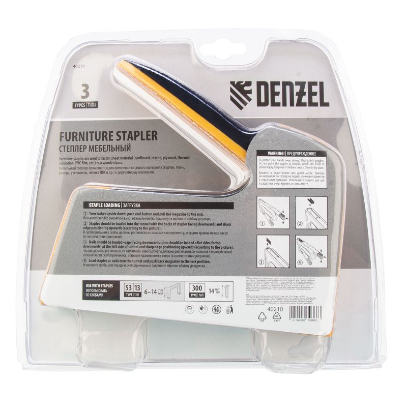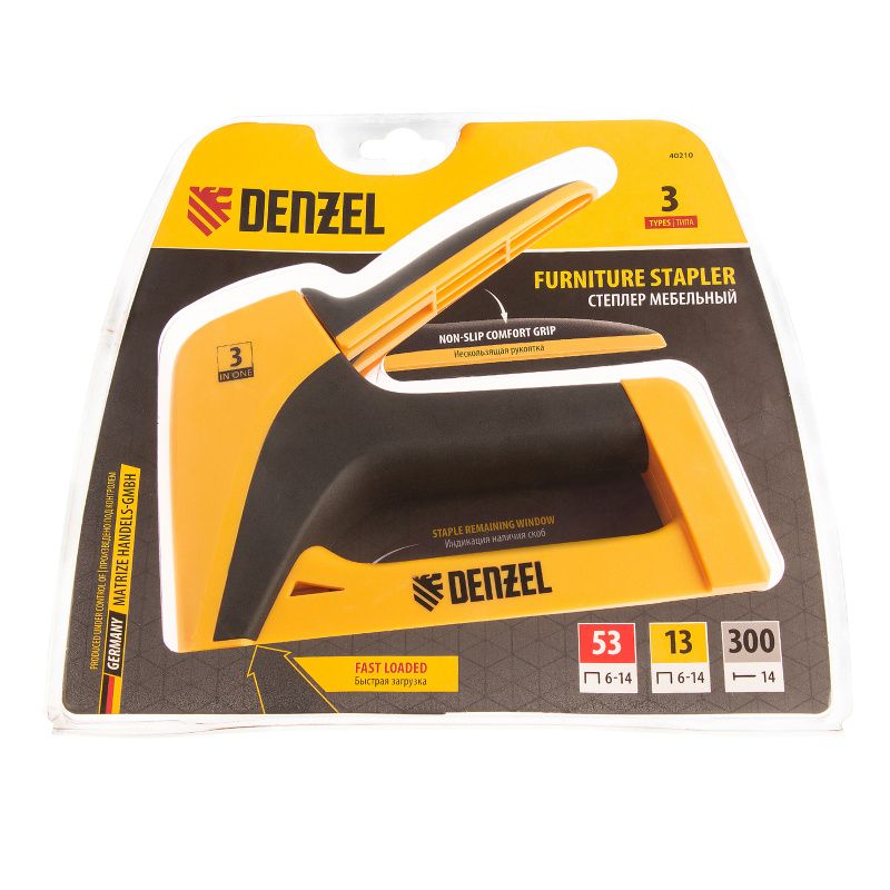 Степлер мебельный, пластиковый корпус, тип скобы: 13, 53, 300, 6-14 мм, Denzel, 40210