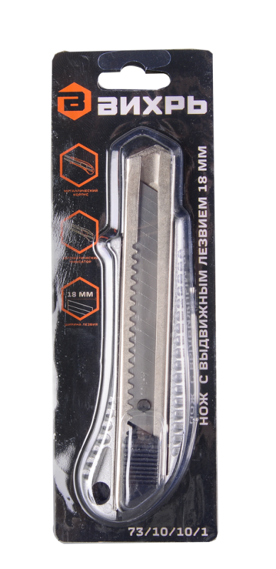 Нож с выдвижным лезвием 18 мм, металлический корпус, металлическая направляющая, автоматический фиксатор, Вихрь, 73/10/10/1