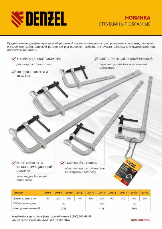 Струбцина F-образная, 120x600мм, кованая Denzel, 20479