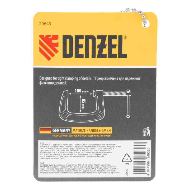 Струбцина G-образная, усиленная, 100 мм Denzel, 20643