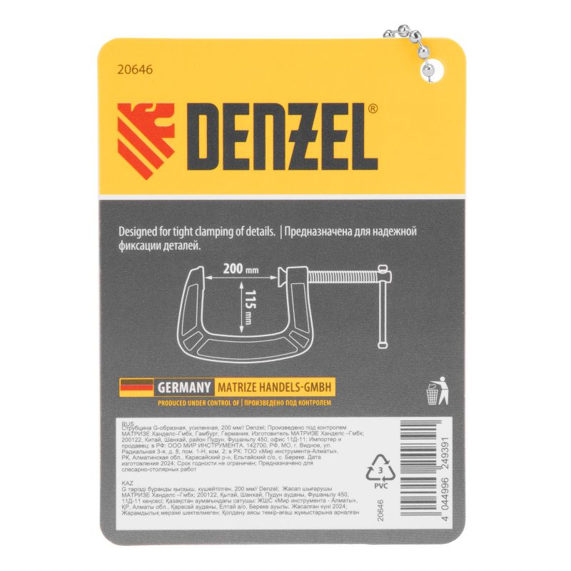 Струбцина G-образная, усиленная, 200 мм Denzel, 20646