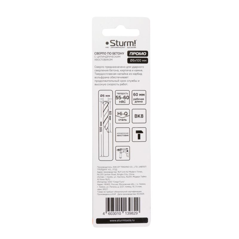 Сверло по бетону, 6x120мм, твердосплавная напайка BK8, цилиндрический хвостовик, Sturm PROMO, 1055-06-06x100SP