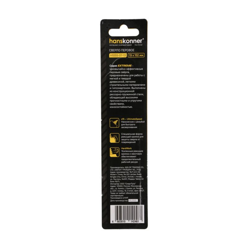 Сверло перовое по дереву 13мм, высококачеств. сталь, шестигр. хвостовик, Hanskonner, H1055-07-13