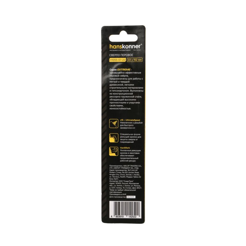 Сверло перовое по дереву 22мм, высококачеств. сталь, шестигр. хвостовик, Hanskonner, H1055-07-22
