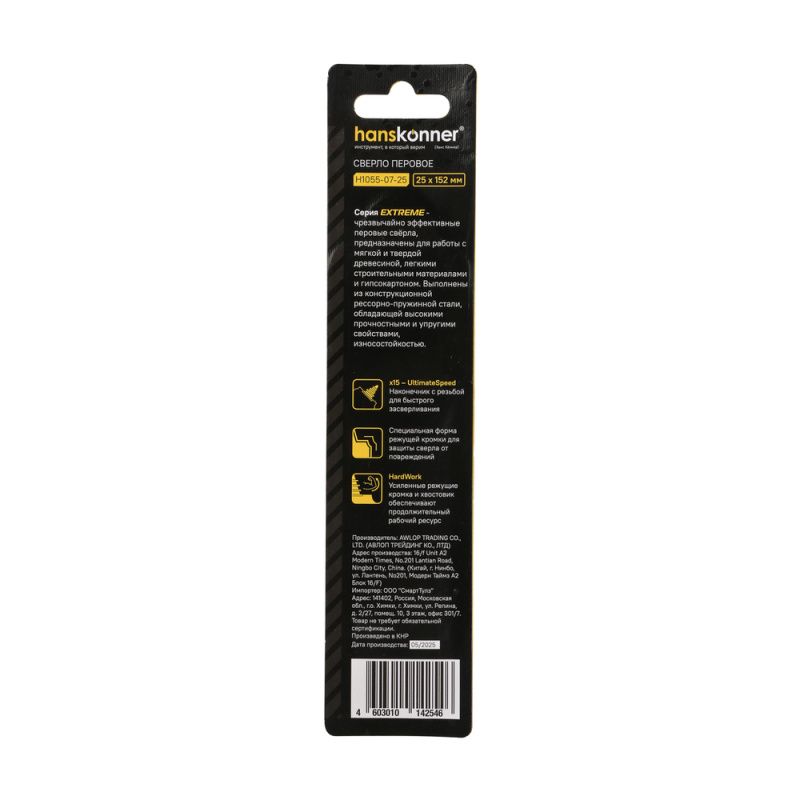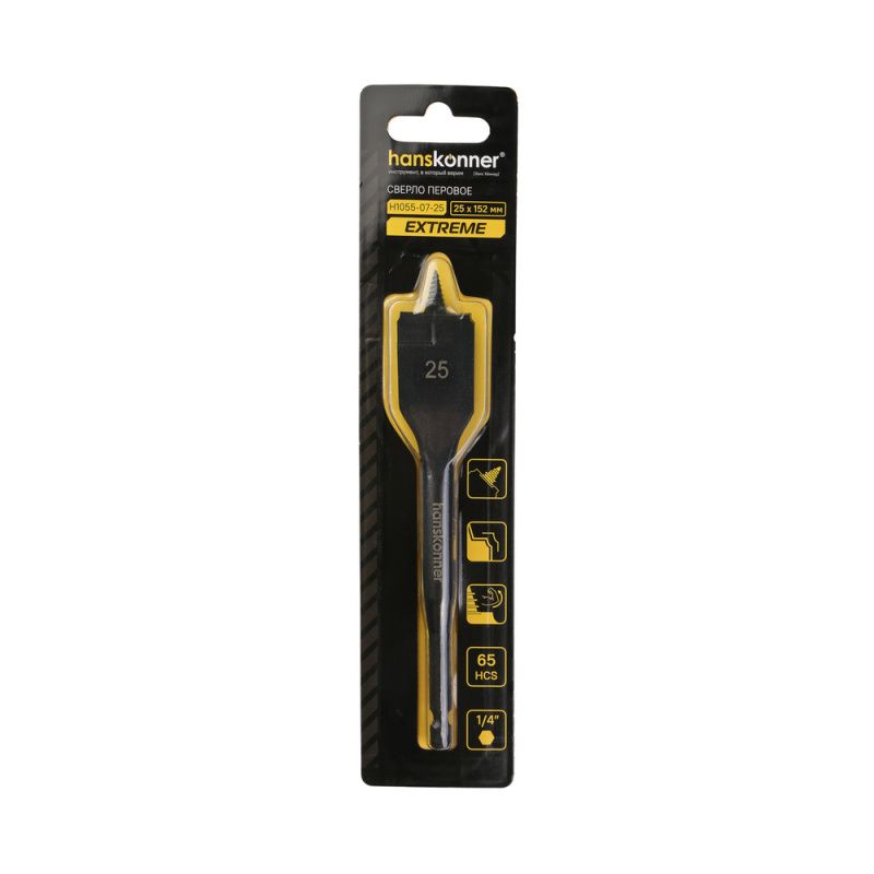 Сверло перовое по дереву 25мм, высококачеств. сталь, шестигр. хвостовик, Hanskonner, H1055-07-25