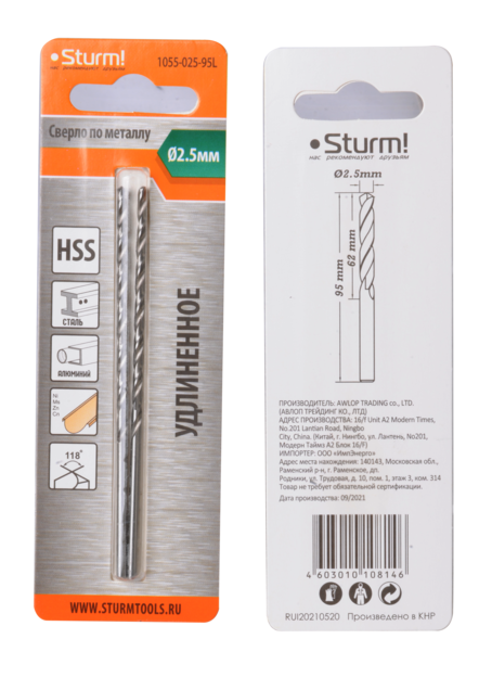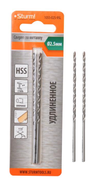 Cверло по металлу Sturm 2,5х95 мм, сталь HSS, удлинен., 118° ,блистер 2 шт, 1055-025-95L