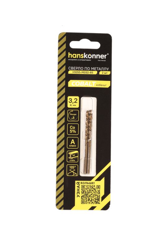 Сверло по металлу COBALT 3,2х65мм Hanskonner, H1055-M032-65