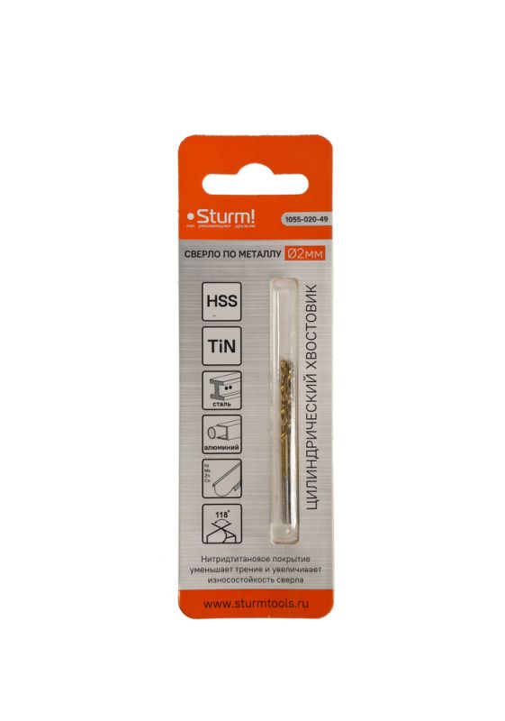 Сверло по металлу Sturm 2,0х49 мм, сталь HSS, нитридтитан., 118° ,блистер 2 шт, 1055-020-49