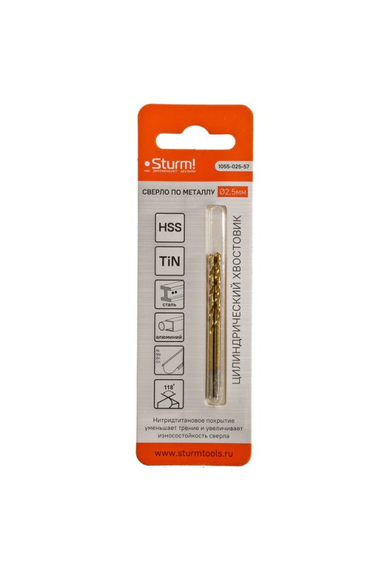 Сверло по металлу Sturm 2,5х57 мм, сталь HSS, нитридтитан., 118° ,блистер 2 шт, 1055-025-57