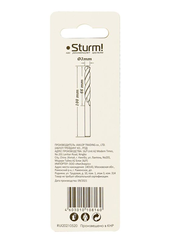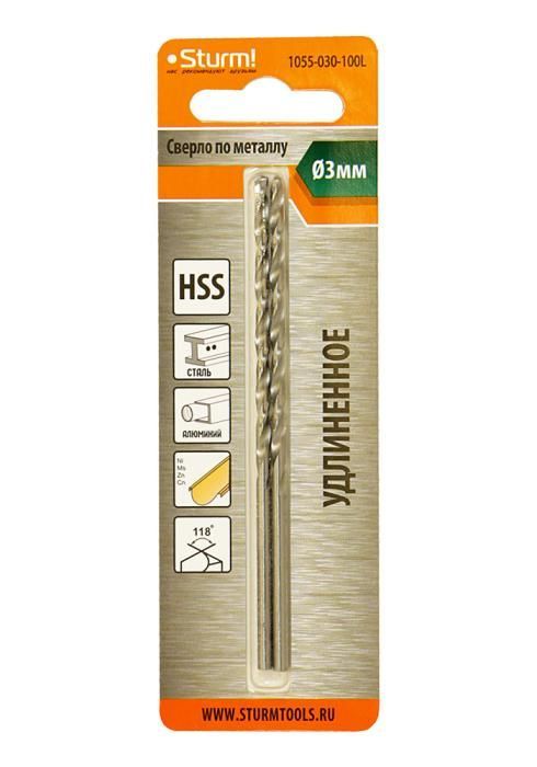 Сверло по металлу Sturm 3,0х100 мм, сталь HSS, удлинен., 118° ,блистер 2 шт, 1055-030-100L