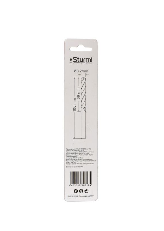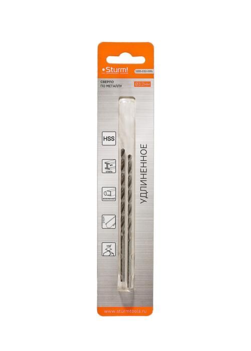 Сверло по металлу Sturm 3,2х106 мм, сталь HSS, удлинен., 118° ,блистер 2 шт, 1055-032-106L